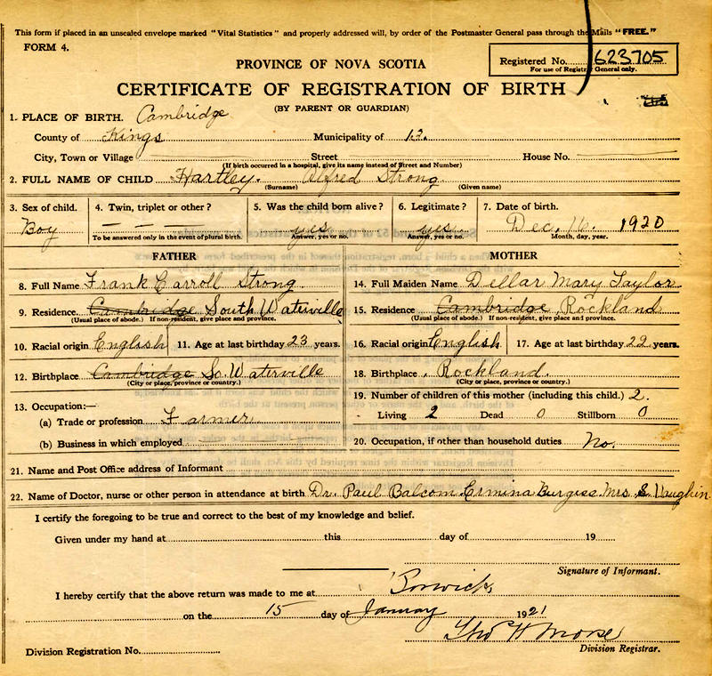 Parents Father: STRONG, Frank Carroll Mother: TAYLOR, Della Mary Birth Born on December 16, 1920 in Cambridge Station, Kings Co., NS Death Died on May 19, 2011 in Kentville, Kings Co., NS Buried in Cambridge Station, Kings Co., NS Marriages SCHOFIELD, Lenora Blanch Children STRONG, Diane STRONG, Gertrude STRONG, Carolyn STRONG, Vincent Hartley: August 19, 1955 - January 11, 2010 Notes Occupation: Truck Driver Obituary: STRONG, Hartley Alfred - 90, South Waterville, Kings Co., passed away on Thursday, May 19, 2011, in the Valley Regional Hospital, Kentville. Born in Cambridge Station, Kings Co., he was a son of the late Frank and Della (Taylor) Strong. Hartley had been a truck driver all of his life, retiring from Avon Foods, Berwick. He was a hard worker, owned his own farm and always enjoyed driving his tractor. Hartley enjoyed spending time with his oxen, horses and favourite dog, Elmo. Surviving are daughters, Diane (Gordon Bowlby) Strong; Gertude (Debbie Gabriel) Strong; Carolyn Brown, all of South Waterville; foster daughter, Carol Walsh, Kentville; step-son, Grant (Pat) Lloyd, Coldbrook; daughter-in-law, Heather Strong; step-daughter-in-law, Eileen Lloyd, both of South Waterville; 11 grandchildren; 17 great-grandchildren; sister, Esther Barteaux, Niagara Falls Ont.; several nieces and nephews. Besides his parents, he was predeceased by his wife, Lenora B. (Schofield) Strong; son, Vincent; step-son, Garnet Lloyd; brothers, Angus, Harold, Orley and Laurice; sisters, Pauline Lutz and Edna McGee. In accordance with Hartley's wishes there will be no visitation or funeral service and a private interment will take place at a later date. Donations in his memory may be made to the Canadian Cancer Society or to any charity. Arrangements are under the care and direction of the Serenity Lindsay Funeral Home, 192 Commercial St., Berwick, N.S., B0P 1E0, (902-538-9900). Condolences may be sent to the family at the funeral home address or on-line by visiting: www.serenitylindsayfuneralhome.ca Sources Funeral Home: Serenity Lindsay Funeral Home Berwick,NS Obituary May 2011 Images Hartley Strong Birth Hartley & Lenora (Schfield) Strong