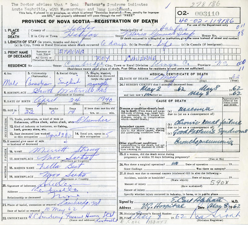 Parents Father: STRONG, Merritt Menzo Mother: BEST, Della Viola Birth Born on April 24, 1940 in South Waterville, Kings Co., NS Death Died on May 08, 1962 in Halifax, Halifax Regional Municipality, NS Buried in Cambridge United Baptist Cemetery in Cambridge Station, Kings Co., NS Notes Occupation: Plumber Death: Uremia/ Chronic Renal Failure Sources Nova Scotia Deaths: Year 1962 #3110 Images Menzo & Roy Strong Roy Strong Death