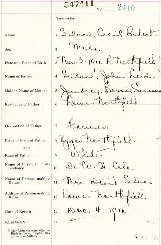 Birth Born on November 03, 1911 in Lower Northfield, Lunenburg Co., NS Death Died on December 02, 2002 in Berwick, Kings Co., NS Buried in Berwick Cemetery in Berwick, Kings Co., NS Marriages SILVER, Gyneth Marguerite Married on April 16, 1938 in North River, Lunenburg Co., NS Children SILVER, Keith SILVER, Sherald Margaret: November 02, 1942 - September 04, 2008 Notes Occupation: Farmer Sources Findagrave.com: https://www.findagrave.com/memorial/282485429/cecil_robert-silver Images Cecil Silver Birth Gyneth Silver Marriage