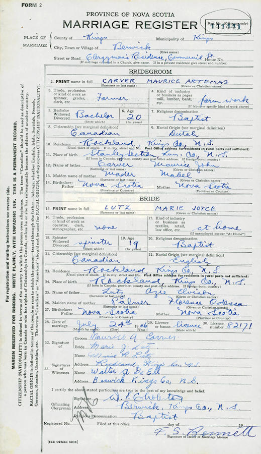 Parents Father: LUTZ, Azie Elvison Mother: PALMER, Florence Odessa Birth Born on January 21, 1927 in Rockland, Kings Co., NS Death Died on October 02, 2019 in Middleton, Annapolis Co., NS Buried in Aylesford Union Cemetery in Aylesford, Kings Co., NS Marriages CARVER, Maurice Artremas Married on July 24, 1946 in Berwick, Kings Co., NS Children CARVER, Linda CARVER, John Notes Obituary: January 31, 1927 - October 2, 2019 Carver, Marie Joyce ~ 92, of Millville, Kings Co. passed away peacefully Wednesday, October 2, 2019, in Soldiers' Memorial Hospital, Middleton, with her son at her side. Born in Rockland, Kings Co., she was a daughter of the late Azie and Florence (Palmer) Lutz. Marie was a loving wife, mother, grandmother and great-grandmother, who loved working alongside her husband on the family farm. She was a member of the Aylesford Baptist Church. Surviving are her daughter Linda Hiltz, Wellington, Yarmouth Co.; son, John (Joanne) Carver, Aylesford; grandchildren, Michael (Karen) Hiltz, Wellington; Monnette (Keith) Ebbett, Wellington; Matthew (Elisha) Hiltz, Bridgewater; Andrew (Natasha) Hiltz, Wellington; Joshua (Melanie) Hiltz, Wellington; Tanya Carver, Long Island, NS; Chrystal (Branden) Duguay, Trenton, ON; John Jr. Carver, Aylesford; great- grandchildren, Caeleb, Bailee, Courtney, Emma, Seth, Ellie, Jenna, Janaya, Boden, Nathaniel, Madeline, Gabrielle, Andie Jacqueline "AJ", Chaysen, Mason, Riley, Kaylee; sisters, Janice (Robert) Dunn, Berwick; Carolyn (Bill) Schrage, Ottawa, ON; Marina (Charles) Hudson, Salisbury, NB; brothers Hardy (Jessie) Lutz, Berwick; Robert (Maureen) Lutz, Berwick. Besides her parents, she was predeceased by her husband Maurice; sisters, Bessie, Bertha, Carrie, Helen, Margaret, Doris, Rose; brothers Whitney, Carleton, Ronald; son-in-law Gordon Hiltz; great-grandson Grayson. A Celebration of Life will be held 1:30 pm Saturday, October 12, 2019 in the Aylesford Baptist Church with Rev. Clyde Lowe and Pastor Patrick Gilbert officiating. A private interment has taken place in the Aylesford Union Cemetery. A reception for family and friends will follow the service. In lieu of flowers, donations in memory may be made to Soldiers Memorial Hospital Transitional Care Unit or a charity of choice. Arrangements have been entrusted to the Middleton Funeral Home, 398 Main St., toll free 1-855-825-3448. On-line guestbook may be signed by visiting: www.middletonfuneralhome.com Sources Funeral Home: Middleton Funeral Home Middleton,NS Obituary October 2019 Images Marie Lutz Marriage Marie Lutz
