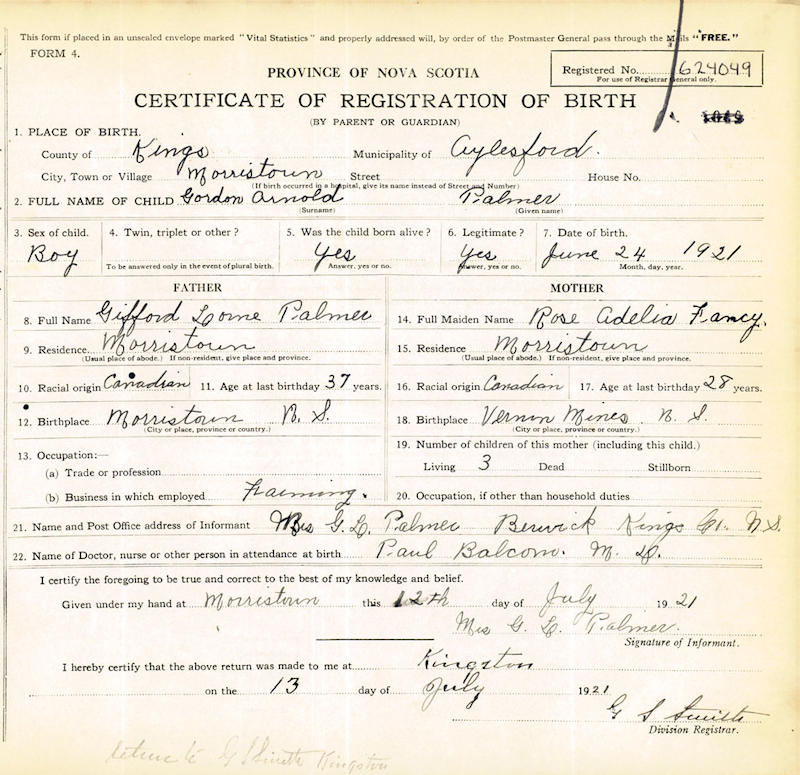 Parents Father: PALMER, Gifford Lorne Mother: FANCY, Rose Adelia Birth Born on June 24, 1921 in Morristown, Kings Co., NS Death Died on January 28, 2015 in Berwick, Kings Co., NS Buried in Morristown Cemetery in Morristown, Kings Co., NS Marriages LUTZ, Doris Edna Married on September 14, 1940 in Berwick, Kings Co., NS Children PALMER, Lester C.: 1941 PALMER, Richard A.: February 04, 1949 Notes Occupation: Farmer Obituary: PALMER, Gordon Arnold \endash age 93, of Berwick, Kings Co., passed away on Wednesday, January 28, 2015, in the Grand View Manor, Berwick. Born in Morristown, Kings Co., on June 24, 1921, he was a son of the late Gifford L. and Rose A. (Fancy) Palmer. Gordon was a life-long farmer, the sixth generation to operate the family farm, taking it over in 1954 and retiring in 1992. He was a former member of the Morristown Baptist Church, having served as Moderator, Sunday School Superintendent, Board of Deacons and Trustees and a member of the choir. For several years Gordon was a member of the Berwick Baptist Church, serving on many committees and a member of the choir. In recent years he became a member of Kingston United Baptist Church. In the past he was president of Berwick Fruit Co. for 17 years. Chairman of Pork Stabilization Board for nine years; past director of Nova Scotia Pork Producers serving as treasurer; past director of Canadian Pork Council; past member of Scotian Gold Co-operative; member of the Federation of Agriculture; member of the Western Kings Livestock Shipping Club; Director, President & Manager of Berwick Strawberry Exchange; Secretary-Treasurer of Morristown Cemetery Company for 33 years; founding member of Berwick Apple Capital Museum; Co-owner of Valley Farm Supplies. Surviving are his wife of 32 years, Sylvia (Ryan) Palmer; sons, Lester (Shirley) Palmer, Berwick; Richard (Wendy) Palmer, Morristown; two grandchildren; two great-grandchildren; brother, John (Winnie) Palmer, Kentville; several nieces and nephews. Besides his parents, he was predeceased by sister, Marguerite (Willy) Keddy; brothers, Lewis (Ann) and Mark Palmer. Visitation will take place from 1-2 p.m., and funeral service at 2 p.m., both on Sunday, February 1, in the Middleton Funeral Home, 398 Main St., Middleton. Rev. Paul Bannister officiating, with a reception to follow. Burial will take place in the Morristown Cemetery. Sources Funeral Home: Middleton Funeral Home Middleton,NS Obituary January 2015 Images Gordon Palmer Birth Gordon Palmer Doris Lutz Marriage Gordon Palmer