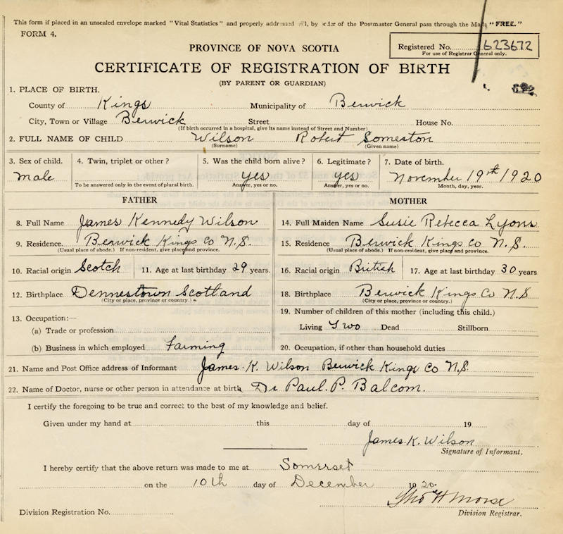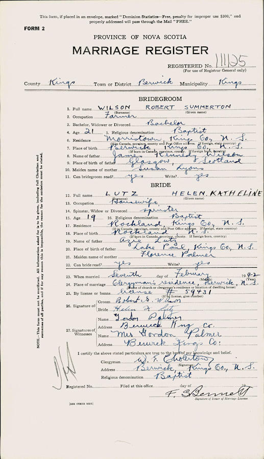 Birth Born on November 19, 1920 in Berwick, Kings Co., NS Death Died on 1983 in Kings Co., NS Buried in Morristown Cemetery in Morristown, Kings Co., NS Marriages LUTZ, Helen Kathleen Married on February 07, 1942 in Berwick, Kings Co., NS Children WILSON, Sheila WILSON, Robert WILSON, Jeanne WILSON, Marlene Notes Occupation: Farmer Sources Kings Cemetery Records: Morristown Cemetery Morristown,NS Images Robert Wilson Birth Robert & Helen (Lutz) Wilson Helen Lutz Marriage