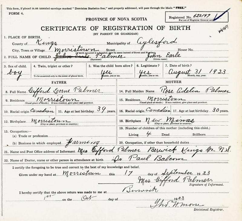 Parents Father: PALMER, Gifford Lorne Mother: FANCY, Rose Adelia Birth Born on August 31, 1923 in Morristown, Kings Co., NS Death Died on June 08, 2019 in Kings Co., NS Buried in Morristown Cemetery in Morristown, Kings Co., NS Marriages LUTZ, Margaret Florence Married on November 27, 1943 in Aylesford, Kings Co., NS Children PALMER, Sandra PALMER, Donna PALMER, Shirley Notes Occupation: Truckman/ Lumberman/ Owner of Home Hardwares Stores Obituary: It is with heavy hearts that the family of John Earle Palmer announces his passing on June 8, 2019 at the age of 95. Born in Morristown on August 31, 1923, he was the son of the late Gifford L. and Rose A. (Fancy) Palmer. John met the love of his life, Margaret, in a Rockland Sunday School class, marrying her in November of 1943. In his early working years, John logged his own trees and operated a small outdoor sawmill, while Margaret looked after the books. In the 1950s, the young couple erected "The Shop" next door to their Morristown home, which would become John E. Palmer Building Supplies Ltd. Their three daughters became involved in the family business, which eventually included sons-in-law, grandchildren and even the great-grandchildren in varying capacities. John was incredibly proud that, from humble beginnings, his business became a family legacy- one that grew and changed over the years to become the "Palmer Group", a group of Home Hardware stores across Nova Scotia. Even at 95, he would regularly visit the family's local Home Hardware stores in Berwick, Wolfville, Kentville and Canning, chatting with customers and staff and hoping to happen upon a family member employed there. John proudly received the Golden Hammer award for 50 years in the Hardware Industry in 2009. He was a member of the Morristown Baptist Church and loved to play cards, especially 45s. He was an avid golfer, proud to have witnessed a hole-in-one but disappointed to have never shot one himself. He enjoyed travel and spent many winters with Margaret at their home in Carefree, Florida. Closer to home, he also loved spending time at his cottage in Lake Paul in the summer. He cherished his family and was especially proud of his grandchildren and great-grandchildren, always interested in their lives and available for golf tips. After nearly 60 years of marriage, he became a widower. He was fortunate to find companionship once again with Winifred Molyneaux, who became his second wife in 2005. John had a quick wit, enjoyed a good joke, and loved to tease. He had a zest for life and (more than) occasionally cheated at cards and golf. His life was rich with love and laughter. We may never know how the Ace of Hearts would land in his shirt pocket or how many mulligans he really had, but we do know that he will be profoundly missed. He is survived by his wife Winifred Palmer, Kentville; daughters Sandra (Garnet) Gould, Canaan; Donna (Raymond) Bishop, Port Williams; Shirley (Stuart) Hinson, Charlottetown; grandchildren Shelley (Mike) Young, Lower Sackville; Kimberley (Charles) Smolenaars, Kentville; Cal Gould, Edmonton; Jyl Bishop Veale (Brian Veale), Wolfville; Leanne Bishop (Michael Mason), Los Angeles; Andrew Bishop (Melissa), Port Williams; Sabrina Hinson, Charlottetown; great-grandchildren, Benjamin, Abigail, Grace and Lucy Smolenaars, Anastasia and Kieran Gould, Olivia and Rachel Veale, and Elliott, Lila and Emmett Bishop. John was the last surviving member of his immediate family. Besides his parents and first wife, he was predeceased by his brothers Lewis, Mark, and Gordon and his sister Marguerite Keddy. A Celebration of Life will be held on Monday, June 17, 2019 at 11:00 am in the Morristown Baptist Church with Rev. Chad Clements officiating. A reception will be held in the Morristown Community Centre following the service. Family only interment will be in the Morristown Cemetery. Family Flowers only. The Service can be viewed live on John's Memorial Page below the obituary. In lieu of flowers, memorial donations may be made to the Morristown Baptist Church. Arrangements have been entrusted to Serenity Funeral Home, Berwick Funeral Chapel, 192 Commercial Street, Berwick, NS, B0P 1E0 (902-538-9900). Sources Funeral Home: Serenity Funeral Home Berwick,NS Obituary June 2019 Images John E. Palmer Birth John E. & Margaret (Lutz) Palmer Margaret Lutz Marriage John E. Palmer