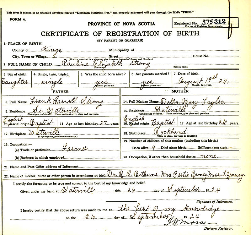 Birth Born on August 19, 1924 in South Waterville, Kings Co., NS Death Died on March 17, 1992 in Berwick, Kings Co., NS Buried in Berwick Cemetery in Berwick, Kings Co., NS Marriages LUTZ, Carleton Azie Married on April 27, 1944 in Berwick, Kings Co., NS Children LUTZ, Leroy LUTZ, Terry LUTZ, Janet Sources Findagrave.com: https://www.findagrave.com/memorial/179380711/pauline_elizabeth-lutz Images Pauline Strong Birth Carleton & Pauline (Strong) Lutz Carleton Lutz Marriage