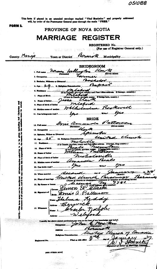 Parents Father: PATTERSON, William Lockhart Mother: BEALS, Amanda Jane Birth Born on September 16, 1902 in Beals Mountain, Annapolis Co., NS Death Died on October 15, 2001 in Cambridge, Kings Co., NS Buried in Berwick Cemetery in Berwick, Kings Co., NS Marriages CLARKE, Vernon Wellington Married on January 02, 1928 in Berwick, Kings Co., NS Children CLARKE, Boy: February 17, 1928 - February 17, 1928 CLARKE, Franklyn Vernon: June 15, 1929 - May 02, 2004 CLARKE, Frederick William: February 17, 1931 - December 28, 2010 CLARKE, Donald Warren: February 01, 1939 - October 28, 1964 CLARKE, Robert: December 10, 1942 - December 10, 1942 Sources Findagrave.com: https://www.findagrave.com/memorial/228479912/dorris-amanda-clarke Images Dorris Patterson Birth Vernon & Dorris (Paterson) Clarke & Donald & Boy Clarke Vernon Clarke Marriage