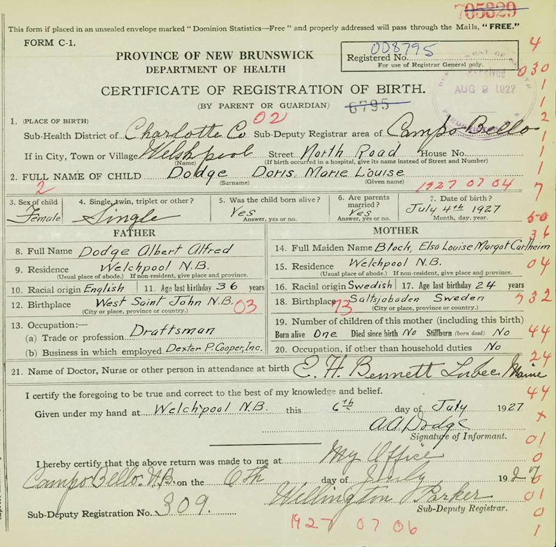 Parents Father: DODGE, Albert Alfred Mother: BLOCK, Elsa Louise Margaret Carlheim Birth Born on July 04, 1927 in Welshpool, Charlotte Co., NB Death Died on 1970 in Stockholm, Sweden Marriages , Blomgren Divorced in 1959 Notes Occupation: Clerk Images Doris Dodge Birth
