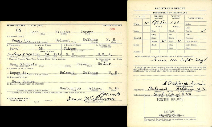Birth Born on April 24, 1912 in Tilton, Belknap Co., NH Death Died on 1975 in Laconia, Belknap Co., NH Buried in Sacred Heart Cemetery in Laconia, Belknap Co., NH Marriages LANGILL, Elaine Bessette Married on May 05, 1945 in Penacook, Merrimack Co., NH Children PARENT, Leon William: December 17, 1946 Notes Occupation: Ski Maker Images Leon Parent Leon Parent WW2 Draft Elaine Langill MarriageA Elaine Langill Marriage