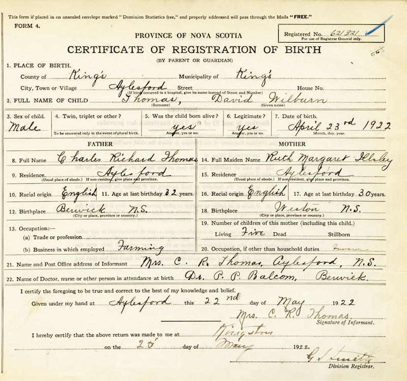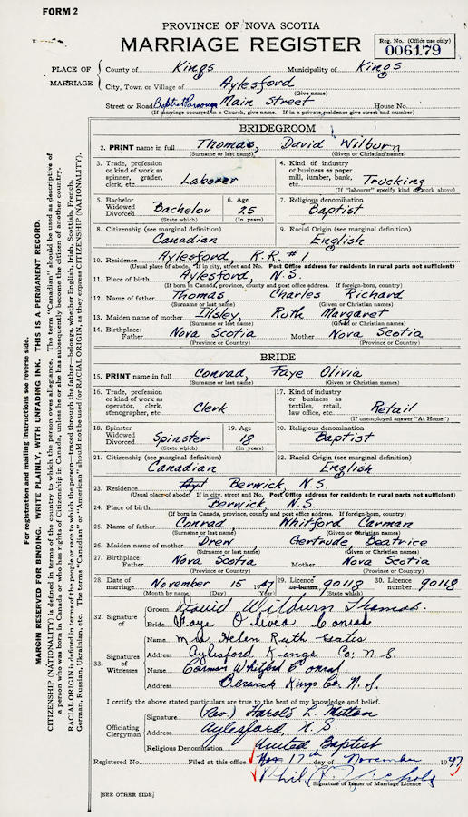Parents Father: THOMAS, Charles Richard Mother: ILLSLEY, Ruth Margaret Birth Born on April 23, 1922 in Aylesford, Kings Co., NS Death Died on October 20, 2013 in Middleton, Annapolis Co., NS Buried in Aylesford Union Cemetery in Aylesford, Kings Co., NS Marriages CONRAD, Faye Olivia Married on November 15, 1947 in Aylesford, Kings Co., NS Children THOMAS, David Roger Notes Occupation: Labourer/ Truck Driver T.P. Calkin Co. Military Service: WW2 RC Army Obituary: April 23, 1922 - October 20, 2013 Thomas, David Wilburn ? age 91 years of Middleton, passed away peacefully at the Veteran?s Wing of the Soldiers Memorial Hospital on October 20, 2013. Born in Aylesford on April 23, 1922; he was the son of the late Charles and Ruth (Illsley) Thomas. For over 30 years David was a proud truck driver for T.P. Calkin in Kentville, and also served as an infantry soldier in WWII. He enjoyed camping, woodworking, playing crib but most of all spending time with his grandchildren and family. David was a huge sports fan and cheered on his Toronto Maple Leafs and Blue Jays. Left with fond and loving memories are his son D. Roger (Elizabeth) Thomas of North Kingston; grandchildren Meghaen Markey-Thomas (Mark Greene) and Justin (Dominique) Markey-Thomas; great grandchildren Brandon and Gavin Thomas-Greene and Gatsby Markey-Thomas; sisters in law Kelsey Herman (Warren), Pauline and Yvonne Conrad all of South Berwick; also by numerous nieces, nephews and a large circle of extended family and friends. Predeceased by his beloved wife of 62 years Faye; brothers Richard, Cyril and Donald in infancy; sisters Marguerite, Bertha, Helen and Audrey; brothers in law Carmen, Delbert, Marshall, Lester, Bill, Frederick and Alvin; sisters in law Kathleen, Evelyn and Shirley. In keeping with David?s wishes, cremation has taken place and a graveside service will be held on Wednesday, October 23, 2013 at 11am from the Aylesford Union Cemetery with Deacon Don Boudreau officiating. Donations in his memory may be made to the NS Arthritis Society (3770 Kempt Road, Suite 210, Halifax, NS B3k 4X8) Online condolences may be made by visiting www.serenitylindsayfuneralhome.ca Arrangements have been entrusted to Serenity Lindsay Funeral Home, Berwick Chapel (192 Commercial St) 538-9900. Sources Funeral Home: Serenity Lindsay Funeral Home Berwick,NS Obituary October 2013 Images David Thomas Birth David & Faye (Conrad) Thomas David Thomas Marriage David W.Thomas