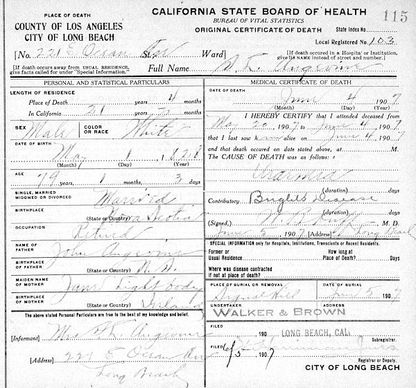 Parents Father: ANGEVINE, John Mother: LIGHTBODY, Jane Anne Birth Born on May 01, 1828 in Cumberland Co., NS Death Died on June 04, 1907 in Long Beach, Los Angeles Co., CA Buried in Signal Hill Cemetery in Long Beach, Los Angeles Co., CA Marriages BIGELOW, Sarah E. Children ANGEVINE, John Clarence: March 15, 1857 - November 02, 1881 ANGEVINE, Manson B.: 1858 - July 02, 1893 ANGEVINE, Herman G.: 1862 - 1924 ANGEVINE, Zenus C.: May 08, 1863 - July 31, 1923 Notes Death: Uremia/ Bright's Disease Sources California Deaths: Long Beach,CA Pg. 115 #103 Images Samuel L. Angevine Death