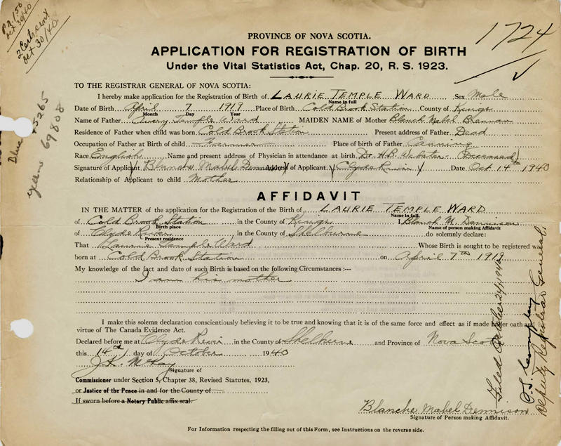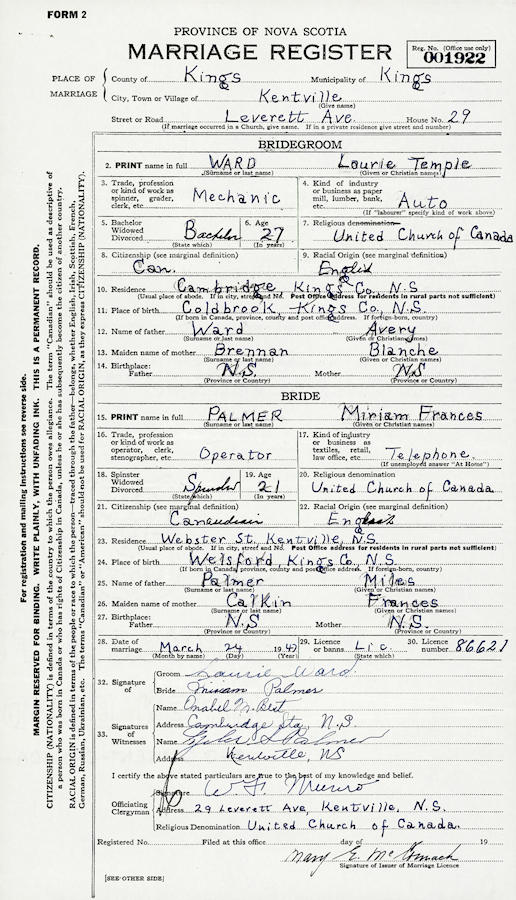 Birth Born on April 07, 1919 in Coldbrook, Kings Co., NS Death Died on 2002 in Kentville, Kings Co., NS Buried in Oak Grove Cemetery in Kentville, Kings Co., NS Marriages PALMER, Miriam Frances Married on March 24, 1947 in Kentville, Kings Co., NS Children WARD, Laurie WARD, Richard WARD, Gregory Notes Occupation: Automobile Mechanic Sources Kings Cemetery Records: Oak Grove Cemetery Kentville,NS Images Laurie Ward Birth Laurie Ward Miriam Palmer Marriage