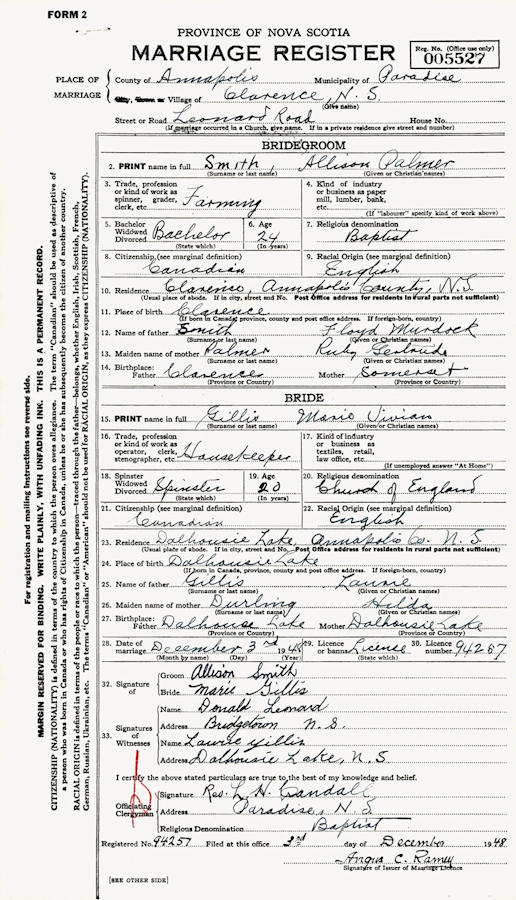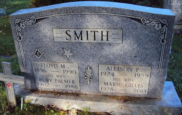 Parents Father: SMITH, Floyd Murdock Mother: PALMER, Ruby Gertrude Birth Born on June 20, 1924 in Clarence, Annapolis Co., NS Death Died on July 12, 1959 in Annapolis Royal, Annapolis Co., NS Buried in Fairview Cemetery in Lawrencetown, Annapolis Co., NS Marriages GILLIS, Marie Vivian Married on December 03, 1948 in Clarence, Annapolis Co., NS Children SMITH, Donald Notes Occupation: Farmer - Truck Driver Death: Automobile Accident Brain Damage/ Fractured Ribs - Punctured Lung Sources Nova Scotia Deaths: Year 1959 #4578 Images Allison Smith Birth Allison Smith Floyd & Ruby (Palmer) Smith & Allison & Marie (Gillis) Smith Allison Smith Death Allison Smith Marriage