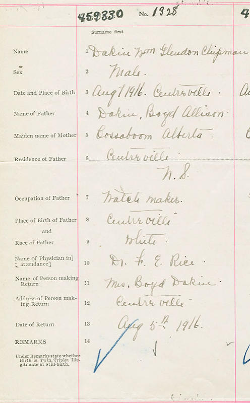 Birth Born on August 07, 1916 in Centreville, Kings Co., NS Death Died on 1990 in Kentville, Kings Co., NS Buried in Berwick Cemetery in Berwick, Kings Co., NS Marriages SANFORD, Marion Elizabeth Sources Kings Cemetery Records: Berwick Cemetery Berwick,NS Images William Dakin Birth William Dakin