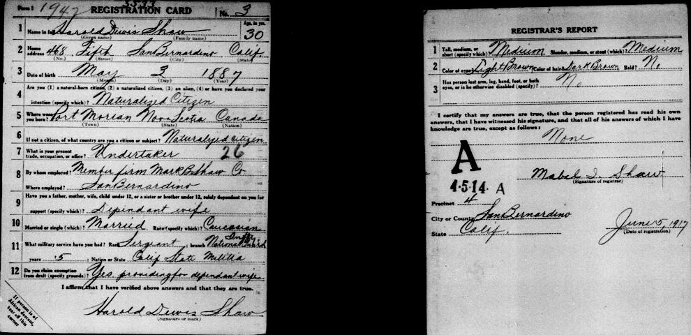 Parents Father: SHAW, Mark Bailey Mother: DEWIS, Antoinette Birth Born on May 03, 1887 in Port Morian, Cape Breton Co., NS Death Died on February 04, 1941 in San Bernardino, San Bernardino Co., CA Buried in Mountain View Cemetery in San Bernardino, San Bernardino Co., CA Marriages JOHNSTON, Mabel Irene Children SHAW, Dewis Milton: December 03, 1917 - March 29, 1989 SHAW, Muriel M.: December 12, 1919 SHAW, Martha Mabel: August 06, 1925 SHAW, Patricia Ruth: January 01, 1930 - November 15, 1948 Notes Occupation: Mortician/ Real Estate Broker Death: Heart Attack Images Harold Shaw Harold Shaw WW1 Draft Harold Shaw History Harold Shaw Obit