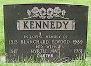 Parents Father: KENNEDY, Sidney Herbert Mother: LANK, Laura Dunbar (Wright) Birth Born on April 24, 1913 in Dartville, Colchester Co., NS Death Died on March 29, 1989 in Truro, Colchester Co., NS Buried in Pleasant Valley Cemetery in Pleasant Valley, Colchester Co., NS Marriages CARTER, Myrtle May Married on May 23, 1936 in Truro, Colchester Co., NS Children KENNEDY, Laurie Allen: September 27, 1936 - July 24, 2020 KENNEDY, Hazel Avis: June 22, 1938 KENNEDY, Sidney Ross: February 06, 1942 - October 09, 2017 KENNEDY, Wenda Myrtle: May 07, 1944 - May 05, 2022 KENNEDY, Orland Elwood: March 25, 1947 KENNEDY, Leroy Eldon: June 10, 1949 - August 30, 1995 Sources Colchester Cemeteries: Pleasant Valley Cemetery #3 Findagrave.com: https://www.findagrave.com/memorial/77689793/blanchard-elwood-kennedy Images Blanchard Kennedy Birth Blanchard & Myrtle (Carter) Kennedy Myrtle Carter Marriage