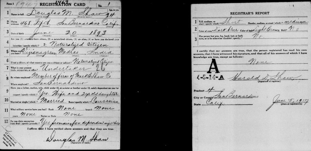 Parents Father: SHAW, Mark Bailey Mother: DEWIS, Antoinette Birth Born on June 20, 1893 in Vizianagaram, India Death Died on November 11, 1953 in San Bernardino, San Bernardino Co., CA Buried in Mountain View Cemetery in San Bernardino, San Bernardino Co., CA Marriages DURBIN, Mary Virginia Children SHAW, Joy Antoinette: October 09, 1915 - October 31, 1994 SHAW, Clella Mae: September 25, 1917 - August 02, 1990 SHAW, Douglas McNeil: December 04, 1919 - November 08, 1942 Notes Occupation: Mortician Obituary: Sponsor this memorial with an exclusive premium layout and no ads. Sponsor this page Douglas McNeil Shaw, the fourth son and child, was born at Vizianagran, India, January 20, 1893, and is a partner with his mother and brother in the Mark B. Shaw Company. He received his education in the public schools of San Bernardino and the Union School of Trades, at Los Angeles, and passed the course in plumbing but was too young at that time to be accepted in the business. He is also a journeyman electrician and a licensed embalmer, has been associated with his father's business since 1911, is interested in oil properties in Texas and in mining properties with the Union Mines Company, which is successfully operating placer property in Mokelumne Hill, Calaveras County, and is otherwise prominent in a business way. He is a Royal Arch Mason and a member of the Benevolent and Protective Order of Elks and the Fraternal Order of Eagles, of the latter of which he is chairman of the board of trustees and a past president. He has been a delegate to both state and national conventions for the Eagles; is a member of the Independent Order of Odd Fellows; the Knights and Ladies of Security; a charter member of the Exchange Club, which has been making a great name in fostering and encouraging aviation; belongs to the Knights of Pythias, the Fraternal Brotherhood and the Woodmen of the World, and has been very active in the affairs of the Sciots, at present being Chief of the Mee. Mr. Shaw married Miss Mary Durbin, a native of Temecula, California, and a daughter of Frank Durbin, a California pioneer, and [p.36] they have three children: Antoinette Joy, attending high school; Cella May and Douglas M., Jr., attending grammar school. Images Douglas Shaw WW1 Draft