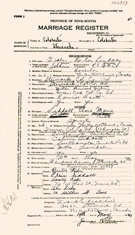 Parents Father: FISHER, Burton Renwood Mother: DARTT, Louisa Jean Birth Born on June 26, 1917 in Lower Stewiacke, Colchester Co., NS Death Died on August 21, 1989 in Truro, Colchester Co., NS Buried in Bible Hill Cemetery in Bible Hill, Colchester Co., NS Marriages SIDDALL, Elsie Marie Married on May 10, 1941 in Stewiacke, Colchester Co., NS Children FISHER, Patricia FISHER, Glen FISHER, John FISHER, Sandra Elsie: September 03, 1948 Notes Military Service: WW2 RC Army Images Berton Fisher Birth Berton & Elsie (Siddall) Fisher Berton Fisher Marriage