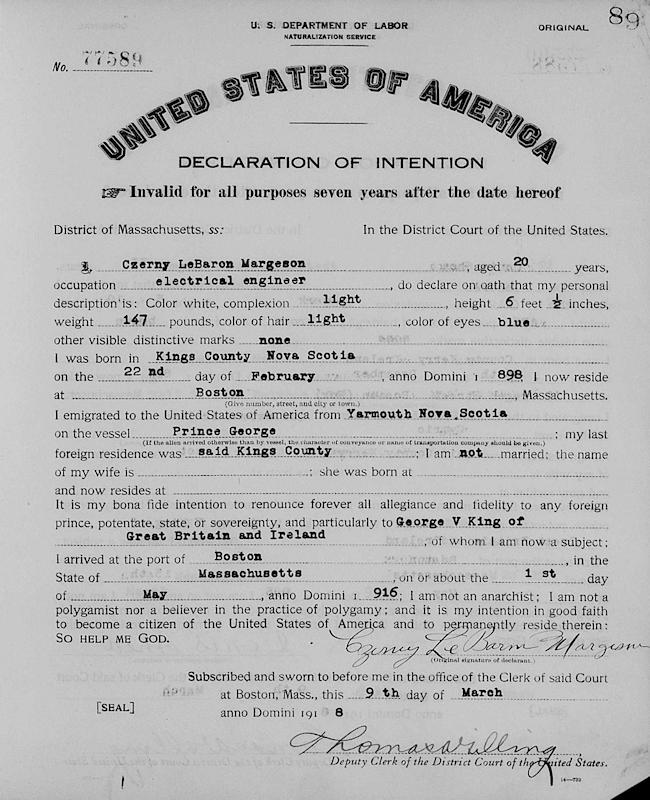 Birth Born on February 22, 1898 in Grafton, Kings Co., NS Death Died on October 04, 1969 in Braintree, Norfolk Co., MA Buried in Milton Cemetery in Milton, Norfolk Co., MA Marriages DEWITT, Marjorie Married on 1936 in Weymouth, Norfolk Co., MA Children MARGESON, Janice Dewitt MARGESON, Kenneth L. Notes Occupation: Electrical Engineer/ Gas Station Operator Sources Mormons: https://www.familysearch.org/en/tree/person/details/L2VR-8VW Images Czerny Margeson Czerny Margeson WW1 Draft Czerny Margeson Naturalization