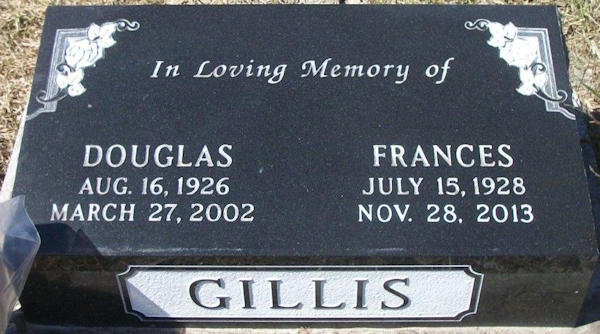 Parents Father: LARRY, John Bachmann Mother: WILSON, Ruth Laird Isabelle Birth Born on July 15, 1928 in Whitewood, Melville Census Division, SK Death Died on November 28, 2013 in Brandon, Brandon Area, MB Buried in Brandon Municipal Cemetery in Brandon, Brandon Area, MB Marriages GILLIS, Douglas Clifford Married on June 30, 1949 Notes Obituary: GILLIS: The family of Fran Gillis announces her passing at the Assiniboine Centre, Brandon, Manitoba on Thursday, November 28, 2013, following a brief illness. Fran Larry was born July 15, 1928 in Whitewood, Saskatchewan She married Doug Gillis on June 30, 1949, in Whitewood. She was predeceased by the love of her life, Doug, in 2002 and by her parents John and Ruth Larry. The Ceremony to Celebrate Fran's Life took place at Memories Chapel on Tuesday, December 3, 2013. Lydia Glawson, Funeral Celebrant officiated. Eulogy was given by her son-in-law Roger Wilson and her granddaughters Devon and Tory Gillis. Pallbearers were Roger, Scott and Taylor Wilson; Barry, Brett and Kelly Cowan. Interment was at the Brandon Cemetery. Sources Cemetery: Brandon Municipal Cemetery Brandon,MB Images Douglas & Frances (Larry) Gillis