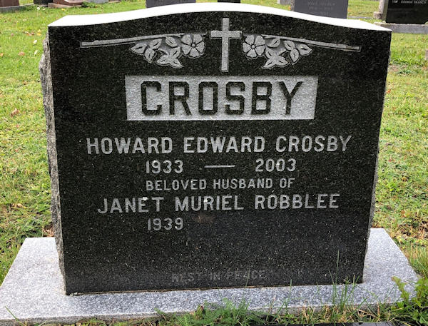 Birth Born on 1933 Death Died on 2003 Buried in Gate of Heaven Cemetery in Lower Sackville, Halifax Co., NS Marriages ROBBLEE, Janet Muriel Children CROSBY, Elizabeth CROSBY, Michael C.: July 15, 1969 Sources Halifax Co. Cemetery Records: Gate of Heaven Cemetery Lower Sackville,NS Images Howard & Janet (Robblee) Crosby