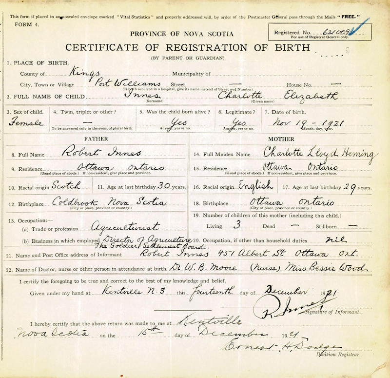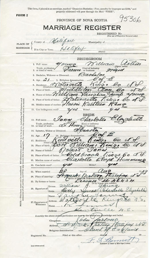 Birth Born on November 19, 1921 in Port Williams, Kings Co., NS Death Died on April 21, 1980 in Waterville, Kings Co., NS Buried in Berwick Cemetery in Berwick, Kings Co., NS Marriages YOUNG, William Arthur Married on August 28, 1939 in Halifax, Halifax Regional Municipality, NS Sources Findagrave.com: https://www.findagrave.com/memorial/258415618/charlotte_elizabeth-young Images Charlotte Innes Birth William & Charlotte (Innis) Young William A. Young Marriage