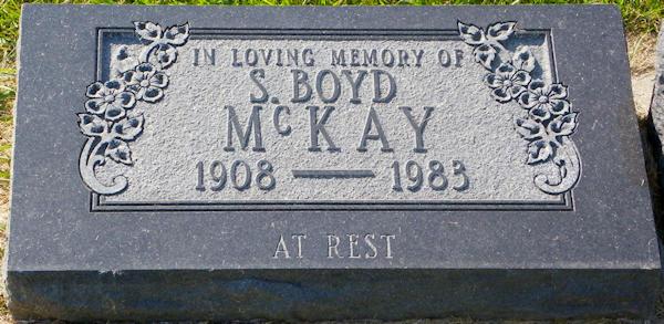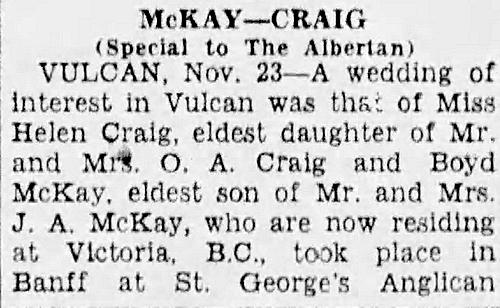 Birth Born on November 23, 1908 in Oxford North, Oxford Co., ON Death Died on April 03, 1983 in Vulcan, Vulcan Co., AB Buried in Vulcan Cemetery in Vulcan, Vulcan Co., AB Marriages CRAIG, Helen Claire Married on 1943 in Banff, Banff Co., AB Sources Findagrave.com: https://www.findagrave.com/memorial/114623097/samuel_boyd-mckay Images Samuel McKay Birth Samuel McKay Helen Craig Wedding The Calgary Albertan Calgary,AB Nov 24,1943