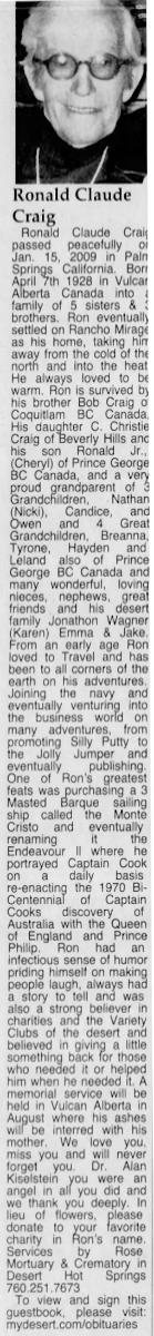 Parents Father: CRAIG, Owen Albert Mother: YOUNG, Mollie Clare Birth Born on April 07, 1928 in Vulcan, Vulcan Co., AB Death Died on January 15, 2009 in Rancho Mirage, Riverside Co., CA Buried in Vulcan Cemetery in Vulcan, Vulcan Co., AB Marriages SMITH, Colleen Vesta (Birdsall) Married on 1969 in Palm Springs, Riverside Co., CA Children CRAIG, Christie Images Ronald Craig Ronald Craig Obit