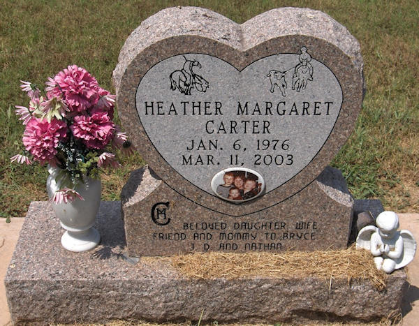 Parents Father: CARTER, David Fred Mother: NIELSEN, Marianne Ann Birth Born on January 06, 1976 Death Died on March 11, 2003 Buried in Lexington Cemetery in Lexington, Cleveland Co., OK Sources Cemetery: Lexington Cemetery Lexington,OK Images Heather Carter
