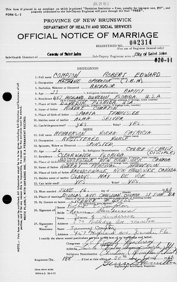 Birth Born on 1939 in Dunedin, Pinellas Co., FL Marriages HENDERSON, Norma Patricia Married on June 16, 1962 in Saint John, Saint John Co., NB Notes Occupation: IBM Machine Operator Images Norma Henderson Marriage