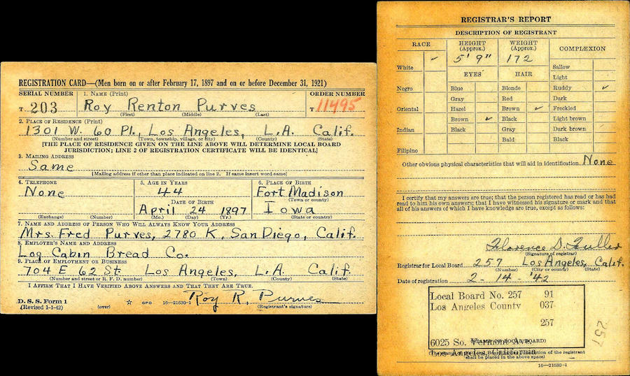 Parents Father: PURVES, Fred Renton Mother: YOUNG, Daisy A. Birth Born on April 24, 1897 in Fort Madison, Lee Co., IA Death Died on August 17, 1979 in Los Angeles Co., CA Buried in Valhalla Memorial Park in North Hollywood, Los Angeles Co., CA Marriages ANDERSON, Martha Elizabeth Children PURVES, Robert Renton: October 19, 1923 - September 07, 2013 Notes Occupation: Manager Flour Mill/ Baker Snowflake Baking Co./ Baker Log Cabin Bread Co. Images Roy Purves WW1 Draft Roy Purves WW2 Draft