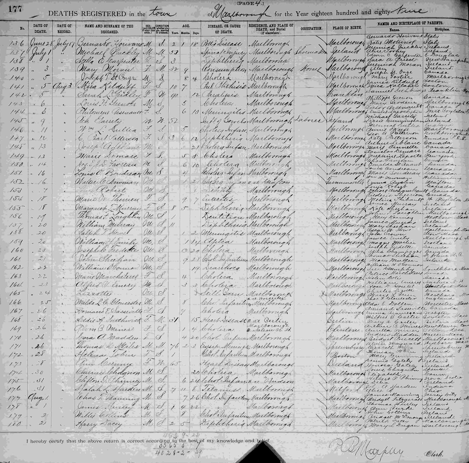 Parents Father: PHINNEY, Herbert Parkman Mother: DAVOCK, Adelia Birth Born on January 17, 1889 in Marlborough, Middlesex Co., MA Death Died on July 31, 1889 in Marlborough, Middlesex Co., MA Sources Massachusetts Deaths: Marlborough Pg. 177 #175 Images Clifton Phinney Birth Clifton Phinney Death