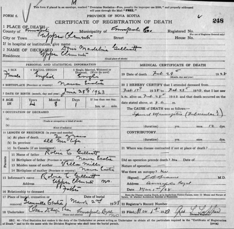 Parents Father: MILLS, Vella Doris Mother: GILLIATT, Robie Cleveland Birth Born on June 28, 1923 in New Glasgow, Pictou Co., NS Death Died on February 29, 1928 in Upper Clements, Annapolis Co., NS Buried in Wadeville Cemetery in Granville Centre, Annapolis Co., NS Notes Death: Spinal Meningitis Sources Nova Scotia Deaths: Year 1928 File 115 #248 Images Doris Gilliatt Birth Doris Gilliatt. Doris Gilliatt Death