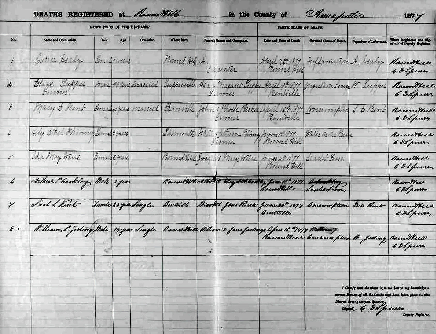 Parents Father: PHINNEY, Walter Willett Mother: NICHOLS, Catherine Birth Born on 1874 in Yarmouth, Yarmouth Co., NS Death Died on June 01, 1877 in Round Hill, Annapolis Co., NS Notes Death: Water On The Brain Sources Nova Scotia Deaths: Annapolis Co. Round Hill #4 Images Lily Phinney Death