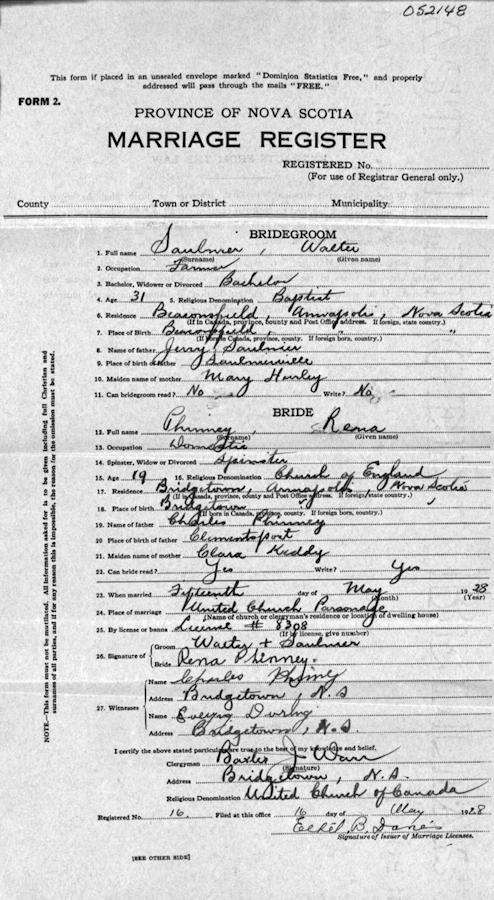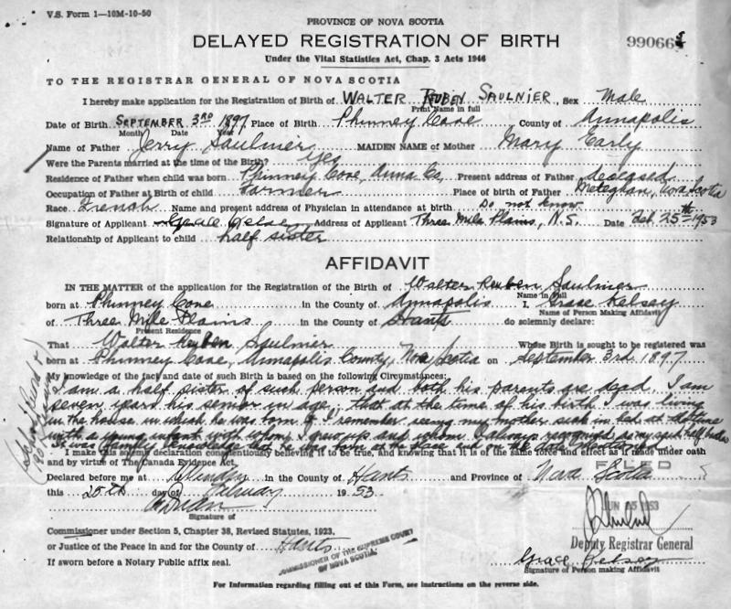 Birth Born on September 03, 1897 in Phinney's Cove, Annapolis Co., NS Death Died on September 30, 1970 in Bridgetown, Annapolis Co., NS Buried in Riverside Cemetery in Bridgetown, Annapolis Co., NS Marriages PHINNEY, Lerena E. Married on May 15, 1928 in Bridgetown, Annapolis Co., NS Notes Occupation: Farmer Death: Acute Myocardial Infarction Military Service: WW1 CEF Sources Nova Scotia Deaths: Year 1970 #7408 Images Walter Saulnier Birth Walter Saulnier Walter Saulnier Death Lerena Phinney Marriage