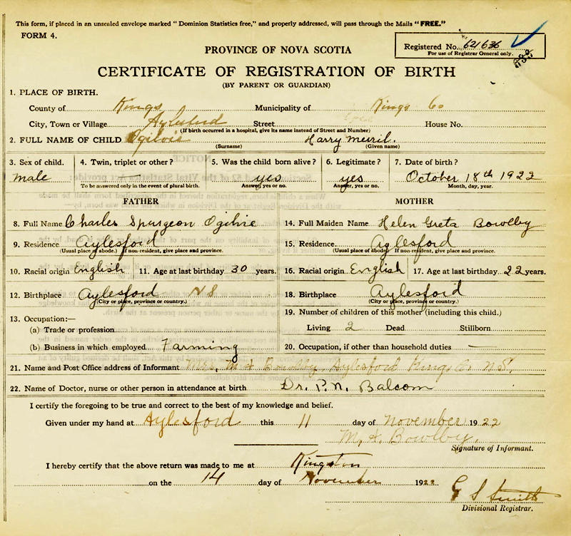 Parents Father: OGILVIE, Charles Spurgeon Mother: BOWLBY, Helen Greta Birth Born on October 18, 1922 in Aylesford, Kings Co., NS Marriages TOOLE, Alberta Ruth Married on September 29, 1949 in Auburn, Kings Co., NS Children OGILVIE, Merrill OGILVIE, Jane OGILVIE, Timothy Charles: September 02, 1956 - February 20, 1957 OGILVIE, Dan Loring: December 04, 1957 - April 03, 1962 OGILVIE, Robert Roy Joseph: February 08, 1963 - November 28, 2014 Images Harry Ogilvie Birth Harry Ogilvie Marriage