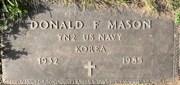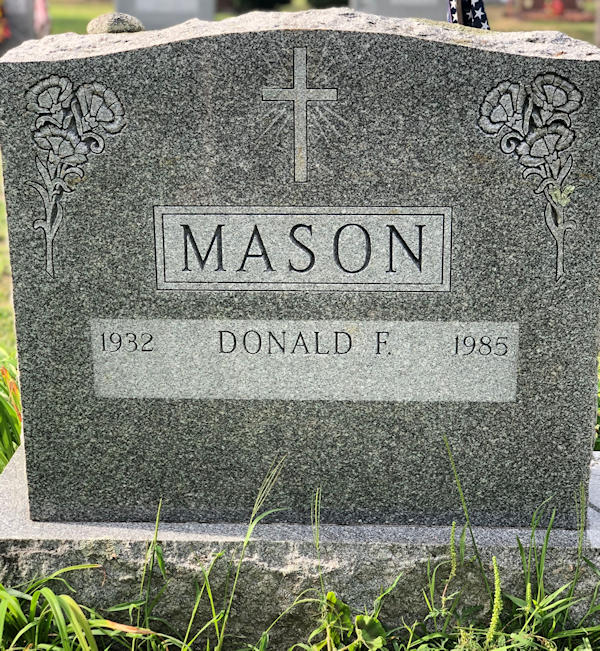 Parents Father: MASON, Donald Lester Mother: LYONS, Helen Leona Birth Born on July 28, 1932 in Weston, Middlesex Co., MA Death Died on July 12, 1985 in Waltham, Middlesex Co., MA Buried in Mount Feake Cemetery in Waltham, Middlesex Co., MA Notes Occupation: Assistant Gardner Military Service: Korea US Navy Sources Massachusetts Deaths: #039289 Images Donald F. Mason1 Donald F. Mason.