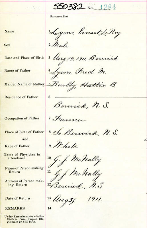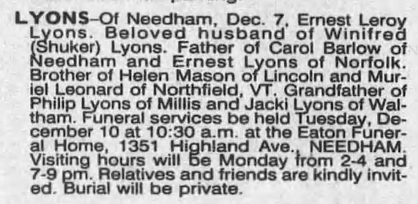 Parents Father: LYONS, Fred Monson Mother: BOWLBY, Hattie Bell Birth Born on August 11, 1911 in Berwick, Kings Co., NS Death Died on December 07, 1966 in Needham, Norfolk Co., MA Marriages SHUKER, Winifred Ella Children LYONS, Carol W.: August 31, 1938 LYONS, Ernest S.: July 10, 1945 Notes Occupation: Driver Oil Co./ Yard Foreman Oil Co. Sources Newspaper Obituary: The Boston Globe Boston,MA Dec 8,1966 Images Ernest Lyons Birth Ernest Lyons Obit The Boston Globe Dec 8,1966
