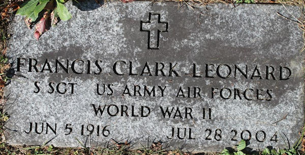 Birth Born on June 05, 1916 in Orwell, Addison Co., VT Death Died on July 28, 2004 in Berlin, Washington Co., VT Buried in Mount Hope Cemetery in Northfield, Washington Co., VT Marriages LYONS, Muriel Frances Married on March 03, 1943 in Andover, Windsor Co., VT Children LEONARD, Karen E.: February 13, 1944 LEONARD, Susan Ann: August 09, 1946 - March 22, 2014 LEONARD, Francis Clark: December 28, 1949 - January 30, 2021 Notes Military Service: WW2 USAAF Staff Sergeant Occupation: Credit Office Manager Sources Vermont Deaths: Vermont Death Records, 1909-2008 Images Francis Leonard Birth Francis & Muriel (Lyons) Leonard & Susan (Leonard) Gregg Francis Leonard Muriel Lyons Marriage