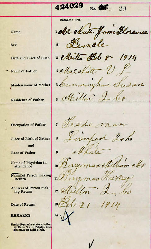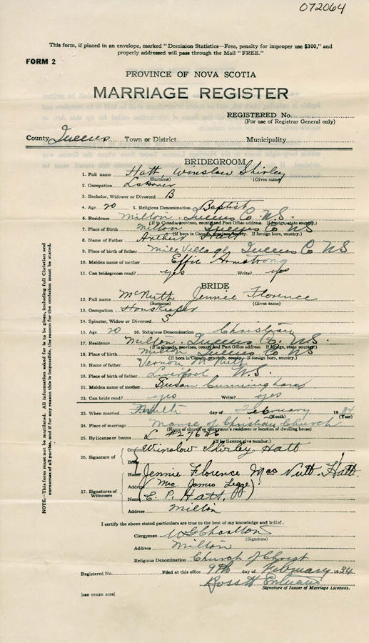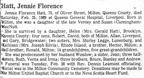 Birth Born on February 08, 1914 in Milton, Queens Co., NS Death Died on February 25, 1989 in Liverpool, Queens Co., NS Buried in Milton Cemetery in Milton, Queens Co., NS Marriages HATT, Winslow Shirley Married on February 09, 1934 in Milton, Queens Co., NS Children HATT, David HATT, Gary HATT, Helen Effie: 1935 - June 21, 2020 HATT, Allen Winslow: 1937 - November 04, 2024 HATT, Robert Bruce: 1938 - January 24, 2017 Sources Newspaper Obituary: Liverpool Advance Liverpool,NS February 1989 Images Jennie MacNutt Birth Winslow & Jennie (MacNutt) Hatt Winslow Hatt Marriage Jennie (MacNutt) Hatt Obit Liverpool Advance Liverpool,NS February 1989