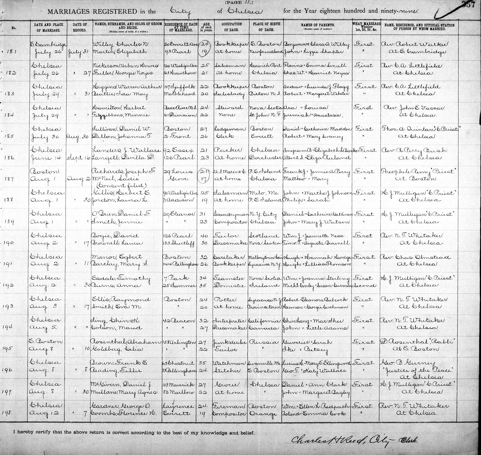 Birth Born on January 22, 1876 in Boston, Suffolk Co., MA Death Died on November 01, 1966 in Newton, Middlesex Co., MA Buried in Newton Cemetery in Newton, Middlesex Co., MA Marriages LANDERS, Joseph Wallace Married on June 14, 1899 in Chelsea, Suffolk Co., MA Children LANDERS, Wallace: June 21, 1900 - June 21, 1900 LANDERS, Beatrice Devilla: July 04, 1902 - March 18, 1986 Notes Occupation: Forelady Garment Factory Sources Findagrave.com: https://www.findagrave.com/memorial/167709063/devilla-devere-landers Images Devilla Langell Birth Joseph Landers Marriage