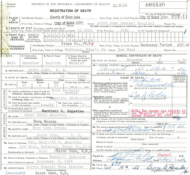 Parents Father: ANGEVINE, James Edwin Clarke Mother: IRVINE, Mary Edna Birth Born on July 26, 1905 in Saint John, Saint John Co., NB Death Died on December 06, 1966 in Saint John, Saint John Co., NB Buried in Fernhill Cemetery in Saint John, Saint John Co., NB Marriages McLEOD, Harriet Gwendolyne Married on September 16, 1933 in Saint John, Saint John Co., NB Children ANGEVINE, David MacLeod: 1937 ANGEVINE, Gerald Edwin: 1941 ANGEVINE, Mary Louise: January 30, 1945 - March 15, 1945 Notes Occupation: Food Product Broker Death: Carcinoma of Colon Images Edwin Angevine Birth Edwin Angevine Death Edwin Angevine Marriage