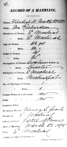 Parents Father: RICHARDSON, William Mother: HOLMES, Harriet Eliza Birth Born on March 15, 1874 in Whiting, Washington Co., ME Death Died on June 05, 1959 in Plainville, Norfolk Co., MA Marriages MATTATALL, Herbert A. Married on March 23, 1895 in East Machias, Washington Co., ME Children MATTATALL, Marcia Belle: January 13, 1896 - February 13, 1952 MATTATALL, Ralph Alick: March 29, 1898 - May 28, 1898 MATTATALL, Frank Sanborn: November 22, 1899 - October 01, 1918 MATTATALL, George H.: April 13, 1903 Images Herbert Mattatall Marriage A Herbert Mattatall Marriage