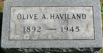 Parents Father: ARCHIBALD, Alfred Gordon Mother: HILDRETH, Bertha Lavinia Birth Born on February 24, 1892 in Lowell, Kent Co., MI Death Died on July 02, 1945 in Grand Rapids, Kent Co., MI Buried in Oakwood Cemetery in Lowell, Kent Co., MI Marriages HAVILAND, Claude Kirtland Married on August 18, 1912 Children HAVILAND, Daniel Claude: June 20, 1915 - December 06, 1996 HAVILAND, Jaeme Hildreth: February 03, 1925 - January 24, 1995 Sources Findagrave.com: https://www.findagrave.com/cgi-bin/fg.cgi?page=gr&GRid=13768495 Images Olive (Archibald) Haviland