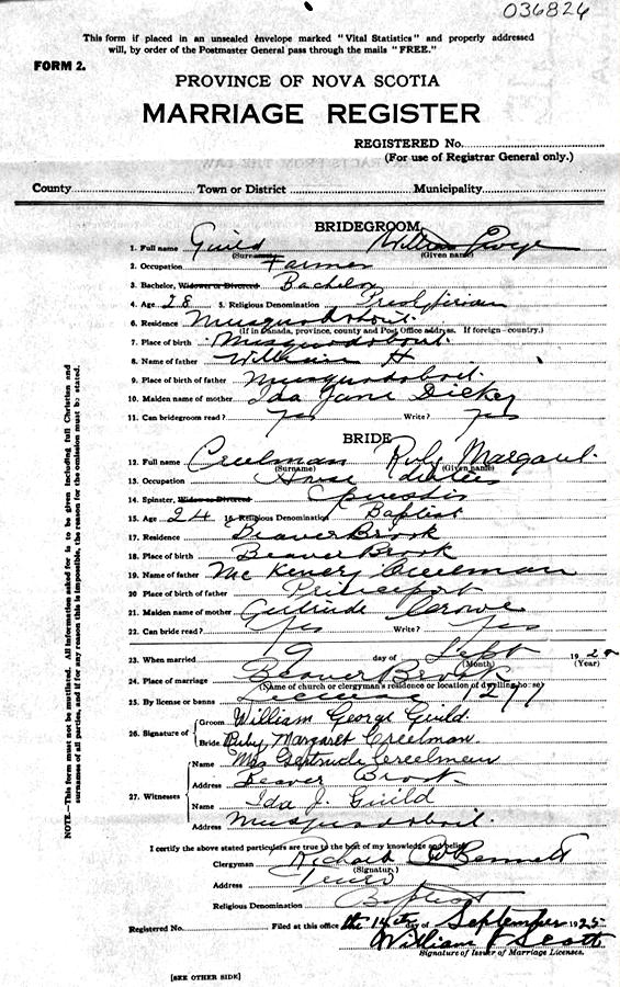 Birth Born on September 08, 1897 in Middle Musquodoboit, Halifax Co., NS Death Died on 1988 Buried in Pioneer Cemetery in Middle Musquodoboit, Halifax Co., NS Marriages CREELMAN, Ruby Margaret Married on September 09, 1925 in Beaver Brook, Colchester Co., NS Children GUILD, Gertrude Louise - January 10, 2005 GUILD, Ruth Marguerite GUILD, Earl William GUILD, Donald Eugene GUILD, Elmer GUILD, Ralph Kenneth GUILD, Florine Carol Notes Occupation: Farmer Sources Colchester Cemeteries: Pioneer Cemetery, Middle Musquodoboit #325 Images Ruby Creelman Marriage
