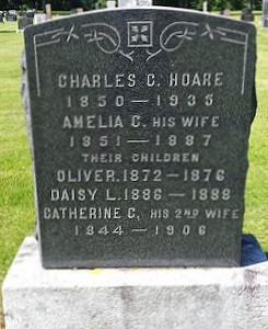 Birth Born on 1851 in Onslow, Colchester Co., NS Death Died on 1887 in Colchester Co., NS Buried in Crossroads Cemetery in Valley, Colchester Co., NS Marriages HOARE, Charles Calvin Married on March 07, 1872 in Truro, Colchester Co., NS Children HOARE, Nellie May: November 27, 1880 - September 20, 1963 Images Charles & Amelia (Thompson) Hoare