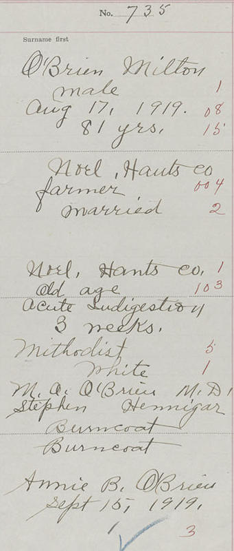 Parents Father: O'BRIEN, Samuel Mother: YUILL, Eleanor Birth Born on March 22, 1838 in Noel, Hants Co., NS Death Died on August 17, 1919 in Noel, Hants Co., NS Buried in Burntcoat Cemetery in Burntcoat, Hants Co., NS Marriages CROWE, Alice M. Married on January 21, 1886 in Truro, Colchester Co., NS Children O'BRIEN, Cassie Mildred: April 27, 1895 - 1984 Notes Occupation: Farmer/ Ship Builder Death: Old Age Sources Nova Scotia Deaths: Book 35 Pg. 627 #735 Images William O'Brien William O'Brien Death William O'Brien Marriage