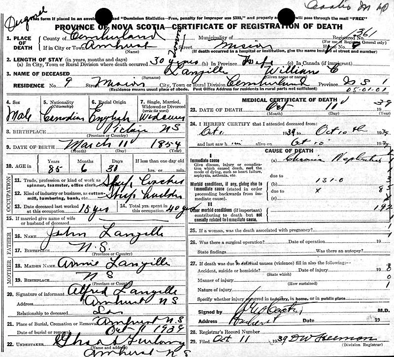 Parents Father: LANGILLE, James L. Mother: LANGILLE, Ellen Birth Born on March 12, 1855 in Brule Point, Colchester Co., NS Death Died on October 10, 1939 in Amherst, Cumberland Co., NS Buried in Amherst, Cumberland Co., NS Marriages JOUDREY, Elizabeth Children LANGILLE, Alfred William: February 24, 1883 - June 29, 1964 LANGILLE, Edith: August 17, 1888 LANGILLE, Minnie A.: October 17, 1892 - August 25, 1919 LANGILLE, Effie Elversa: March 29, 1894 - March 04, 2004 Notes Occupation: Farmer/ Ship Caulker Death: Chronic Nephritis Sources Nova Scotia Deaths: Book 187 Pg. 361 Images William C. Langille Death