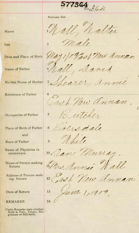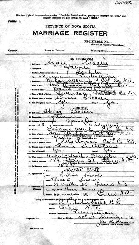 Birth Born on May 01, 1909 in East New Annan, Colchester Co., NS Marriages SHEARER, Lillian Katherine Married on December 24, 1930 in Truro, Colchester Co., NS Children WALL, Muriel Jessie Notes Occupation: Farmer Images Walter Wall Birth Walter Wall Marriage