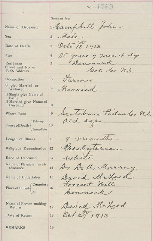 Birth Born on March 13, 1828 in Scotsburn, Pictou Co., NS Death Died on October 18, 1913 in Denmark, Colchester Co., NS Buried in Forest Hill Cemetery in Denmark, Colchester Co., NS Marriages MACLEOD, Isabella J. Children CAMPBELL, Martha Anne: April 06, 1864 - March 10, 1948 Notes Occupation: Farmer Death: Old Age Sources Nova Scotia Deaths: Book 4 Pg. 294 #1769 Colchester Cemeteries: Denmark,NS Forest Hill Cemetery #41 Images John & Isabella (MacLeod) Campbell John Campbell Death