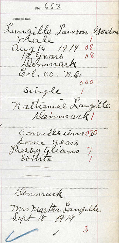 Parents Father: LANGILLE, Nathaniel Jardine Mother: CAMPBELL, Martha Anne Birth Born on 1901 in Denmark, Colchester Co., NS Death Died on August 16, 1919 in Denmark, Colchester Co., NS Buried in Forest Hill Cemetery in Denmark, Colchester Co., NS Notes Death: Convulsions Sources Nova Scotia Deaths: Book 32 Pg. 185 #663 Colchester Cemeteries: Denmark,NS Forest Hill Cemetery #54 Images Martha (Campbell) & Lawson Langille Lawson Langille Death