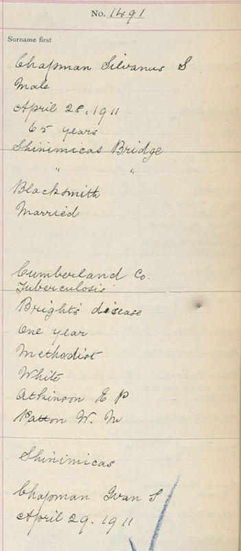 Birth Born on March 04, 1846 in Chapman Settlement, Cumberland Co., NS Death Died on April 28, 1911 in Shinimicas, Cumberland Co., NS Buried in Shinimicas Cemetery in Shinimicas, Cumberland Co., NS Marriages SMITH, Adeline Udvilla Married on July 04, 1873 in Sackville, Westmorland Co., NB Children CHAPMAN, Mary Ann: November 25, 1880 - 1907 Notes Occupation: Blacksmith Death: Tuberculosis/ Bright's Diisease Sources Nova Scotia Deaths: Book 5 Pg. 248 #1491 Images Sylvanus & Adeline (Smith) Chapman Sylvanus Chapman Death